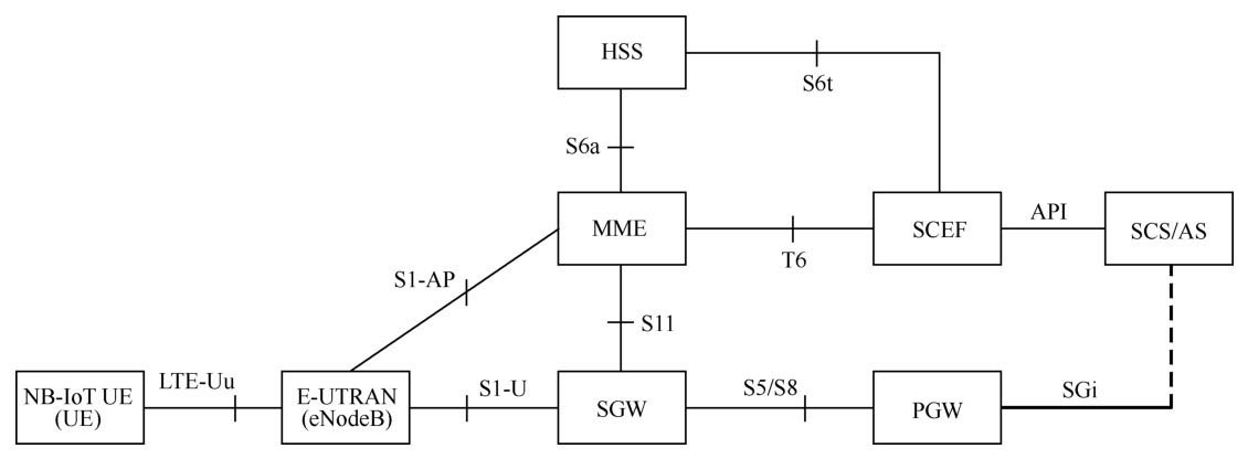 在NB-IoT的网络架构中,包括:NB-IoT终端、E-UTRAN基站(即eNodeB)、归属用户签约服务器(HSS)、移动性管理实体(MME)、服务网关(S-GW)和PDN网关(P-GW)。计费和策略控制功能(PCRF)在NB-IoT架构中并不是必须的。以及为了支持MTC、NB-IoT而引入的网元也不是必须的,包括:服务能力开放单元(SCEF)、第三方服务能力服务器(SCS)和第三方应用服务器(AS)。其中,SCEF也经常被称为能力开放平台。
