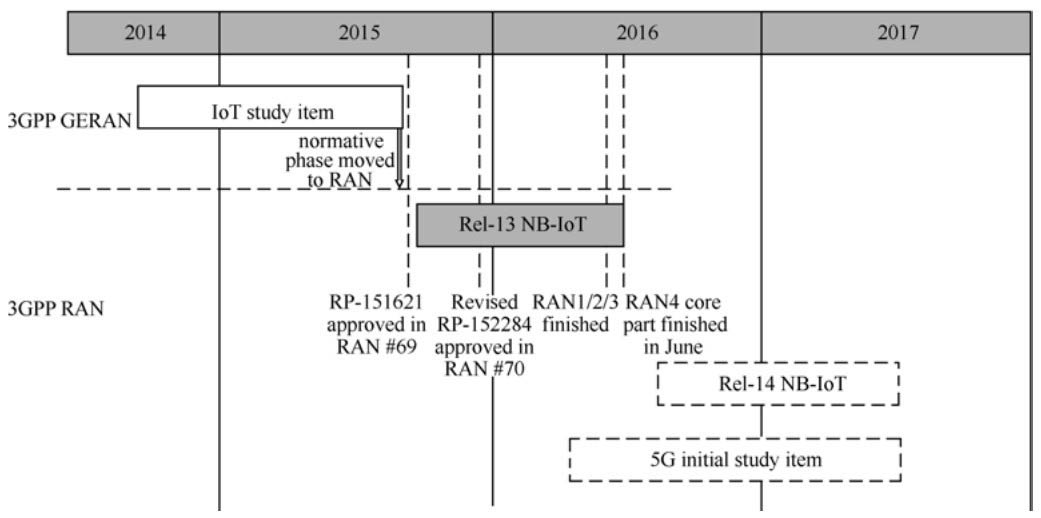 在GERAN工作组关闭前的GERAN #62次全会上,通过了GP-140421 SID“Cellular System Support for Ultra Low Complexity and Low Throughput Internet of Things”,着手研究非后向兼容传统GSM系统的蜂窝物联网(Cellular IoT)方案,以实现在200 kHz系统带宽上支持窄带物联网技术。GERAN工作组中前期研究的Cellular IoT方案 [4] 是非后向兼容的方案,主要针对Stand-alone部署的场景。2015年8月,GERAN工作组输出与窄带物联网相关的研究报告TR 45.820。3GPP PCG #34决定将与窄带物联网相关的标准化工作转至3GPP RAN进行,NB-IoT标准化的时间进度参见图1.2。