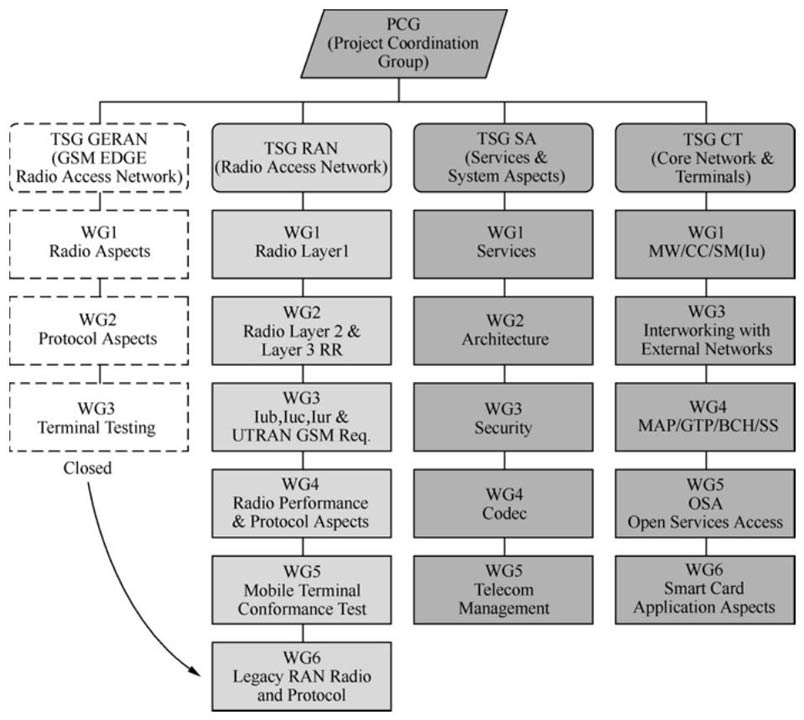 窄带物联网(NB-IoT)的研究和标准化工作是根据3GPP标准组织进行的。3GPP(The 3rd Generation Partnership Project)是欧美中日韩标准化组织合作进行的3G标准化项目,创建于1998年12月,现已延伸到5G。包括欧洲ETSI,美国T1,日本TTC,ARIB和韩国TTA以及我国CCSA都作为组织伙伴(OP)积极参与了3GPP的各项活动。3GPP的项目须得到这些地区的无线通信领域标准化组织的批准。3GPP项目所标准化的产品包括GSM、WCDMA、TD-CDMA、TD-SCDMA、LTE以及LTE-Advanced,当前的重点项目为5G(New RAT)。在TSG GERAN组关闭前,3GPP分为GSM EDGE无线接入网(GERAN)组、业务和系统结构组(SA)、核心网和终端(CT)组和无线接入网(RAN)组。2016年,3GPP在TSG RAN工作组下设立WG6 Legacy RAN radio and protocol,负责维护GERAN工作组相关的协议,逐渐关闭了TSG GERAN工作组,更新后的3GPP组织架构如图1.1所示。