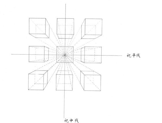 物体只有一个方向的轮廓线垂直于画面,其灭点就是主点;而另两个方向的轮廓线均平行于画面,没有灭点。这时画出的透视,称为一点透视。