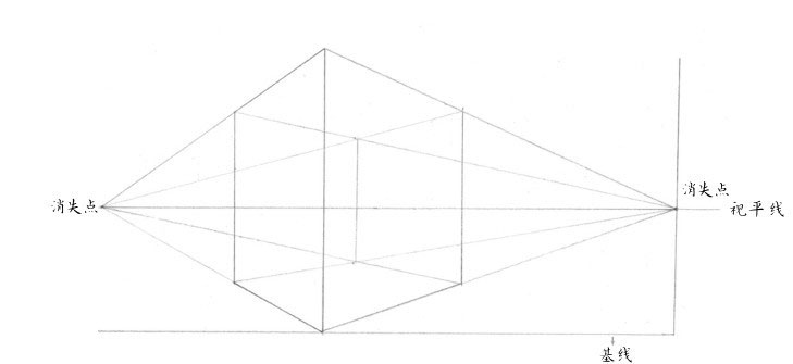 如果物体只有铅垂的轮廓线平行于画面,而另两组水平的轮廓线均与画面斜交,在画面上就会得到两个灭点,这两个灭点都在视平线上。这时画出的透视,称为两点透视。