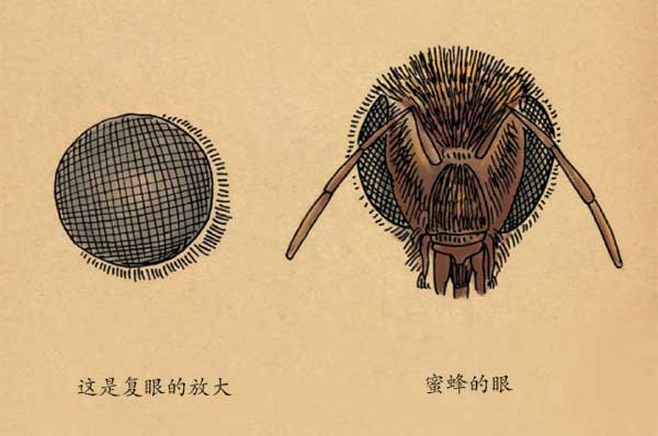 蜜蜂的眼睛在哪里?触角的两旁,有两个突起的东西,就是蜜蜂的大眼睛,叫作复眼。还有哩!在头顶上还有三只小眼睛,叫作单眼。远的东西,近的东西,蜜蜂都能看得见。