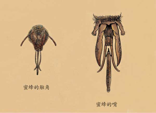 这是蜜蜂的口器。有两对颚,中间的一条是舌。它用颚来咀食物,用舌来舐食物。