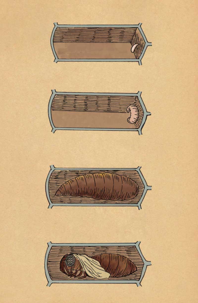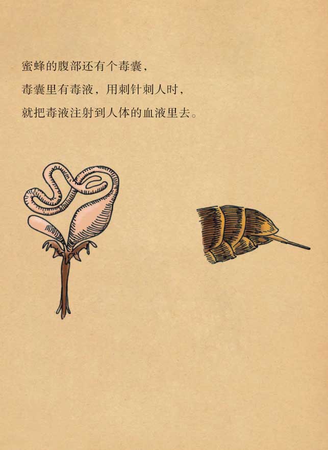 蜜蜂卵里孵出蜜蜂蛆来了,工蜂便采蜜来,喂养它。过了几天,蜜蜂蛆变成只有脚没有翅的东西,叫作蜜蜂蛹。