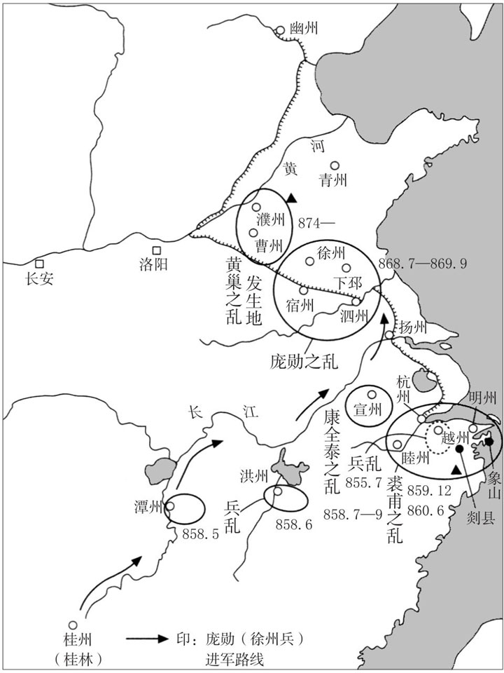 54 兵乱以及裘甫、庞勋、黄巢之乱示意图