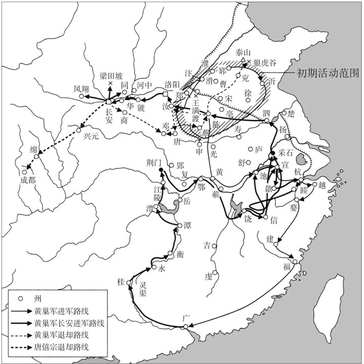 与此相关,在黄巢等的行动中还有一个值得注目的特点,即流寇主义。始于山东西部的这场叛乱,其涉及的范围从大陆最南端的广州到北方的黄河沿线,一直发展到内陆的长安。黄巢的部队一直不停地移动,就连曾经打算安身的广州也不过仅仅占领了不到两个月。而且他们在运动中不断地补给粮食和人员,避开了唐军的集中攻势。中国现代史上的红军长征的移动距离为一万二千五百公里,而黄巢的行程则远远超过了红军的长征。经过黄巢的这场大移动的洗礼,支撑唐王朝的最后的社会基础以及统治体系彻底趋于瓦解。