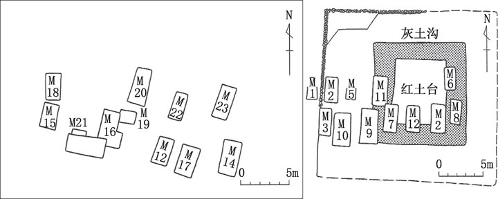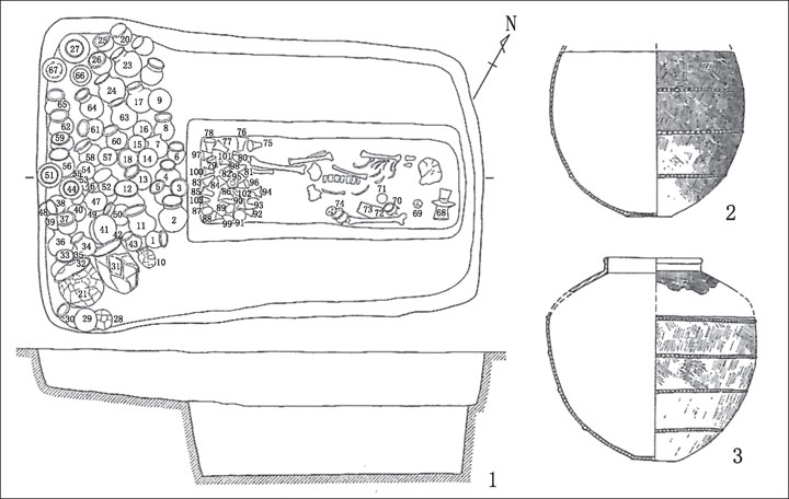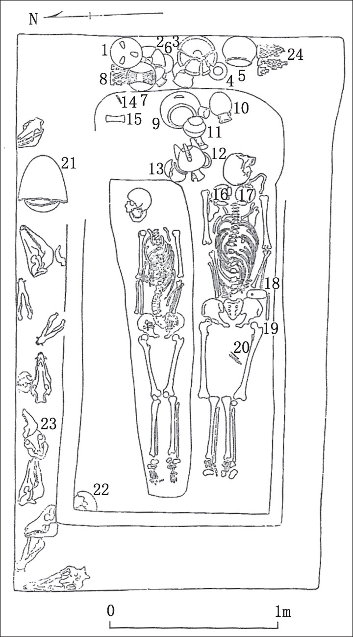 关于这类合葬墓,从性别上来看基本都是男女合葬,两者关系应当不是父母或兄弟姐妹之类的直系亲属关系,而是通过对偶婚结成的夫妇关系。这个事例说明,婚姻家族中已有父系占优势的现象,也可说这意味着男尊女卑的社会差别在此阶段已经诞生。以父系血缘家族为单位,社会差别已开始逐渐深化。