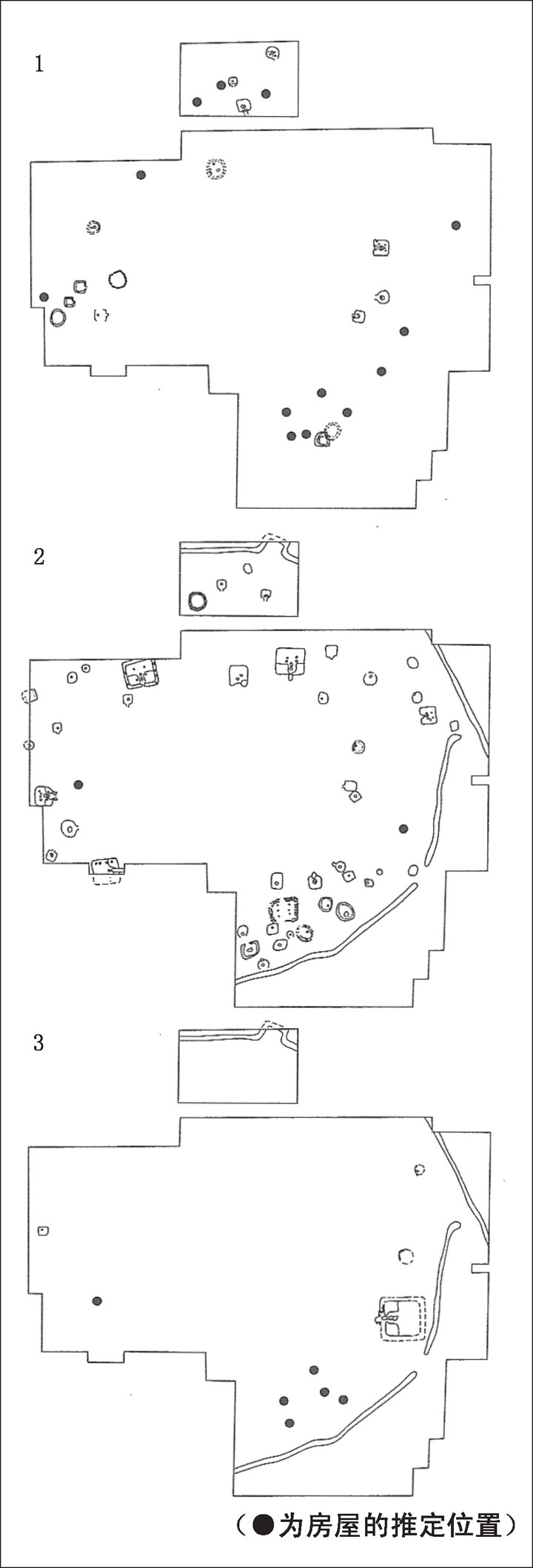 根据发掘情况,从建筑的重叠关系来看,聚落至少可区分为三个时期。此前对聚落的复原方案并未划分时期,而是将其解释为整个时期内同时存在的遗址,我对此无法赞同。