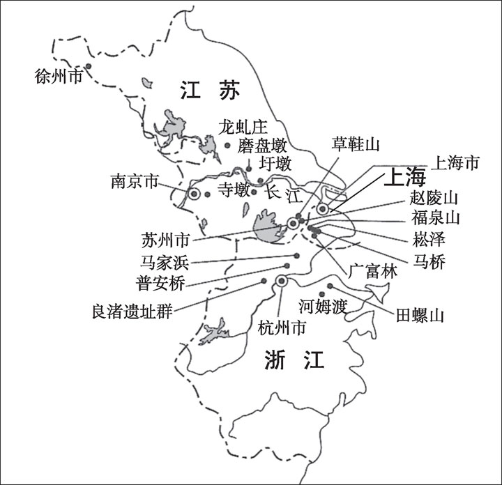 在长江下游地区,以出现于良渚遗址群的巨型祭坛遗址即莫干山遗址为中心,分布着反山遗址、汇观山遗址、瑶山遗址等土墩墓。这些土墩墓原为举行祭祀祖先等活动的场所,而后逐渐形成一族的家族墓地。