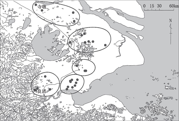 与土墩墓的相对差距对应,墓葬与作为祭祀中心的莫干山遗址的距离也逐渐遥远。以莫干山遗址为中心,周围分布着首领家族的墓葬,更外围分布着贵族家族的墓葬。良渚遗址群也包括拥有防洪功能的土垒和玉器作坊的塘山遗址,呈现出拥有作坊区域的城市形态。然而这里并未发现通常城市遗址中可见的首领阶层及贵族阶层的住宅等上层阶层的房屋遗迹,其形态更偏向墓葬及作为祭坛建筑的人工土台,其特征更接近于祭祀中心。