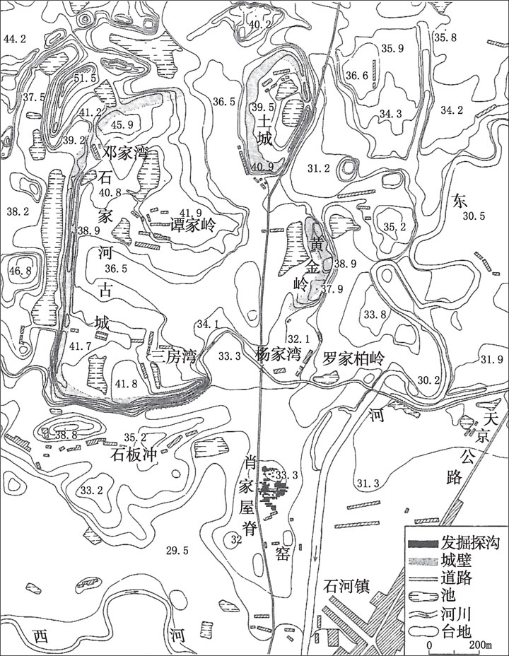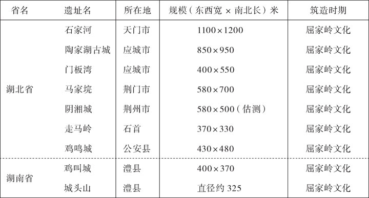 单从规模来比较的话,其立地特征很显然是以汉水流域的石家河遗址为中心。距离石家河遗址越远,城垣规模就越小。可见这些城址遗址在规模大小的差距上显然存在着金字塔式的阶层构造。如果石家河遗址处于中心城市的地位,那么该处也应该存在着强有力的首领或王者。然而在石家河遗址内并未发现显示出强有力的首领或王者的存在的宫殿建筑物。耐人寻味的是,城址遗址均筑造于屈家岭文化时期,且不存在之后的时期新建的城址遗址。
