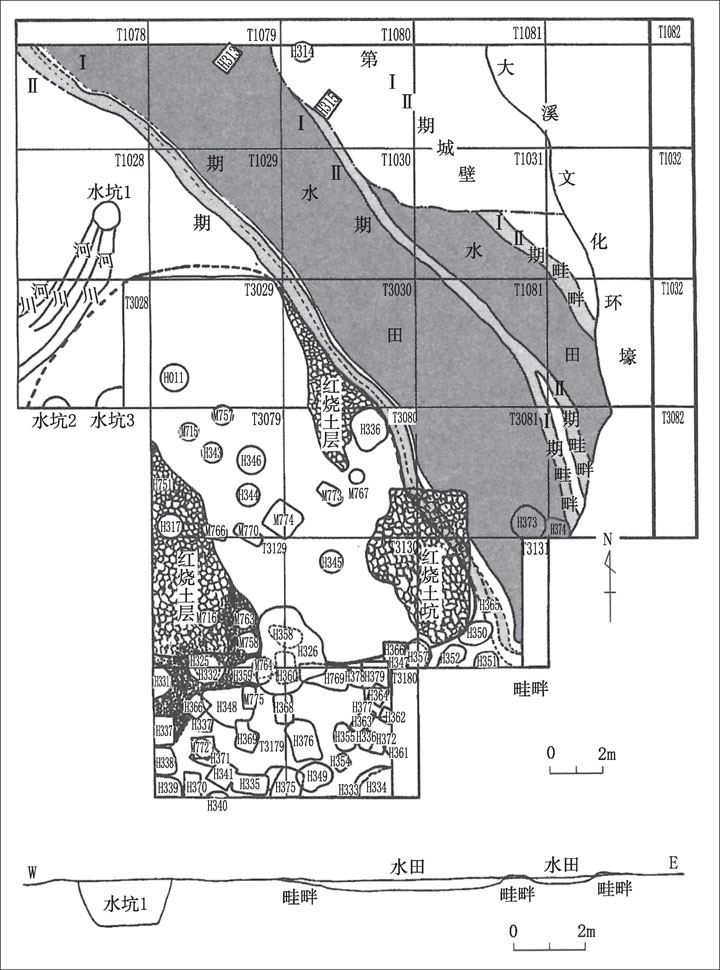 从城头山遗址大溪文化时期的地层中发现了船桨等木制品。与黄河中游地区的姜寨遗址等环壕聚落不同,这里的环壕并非只是用于围绕聚落以防止野兽对食物资源等的侵害。另外,长江流域的聚落大多是在同一地点经不同时期常年居住,往往如同西亚的台形土墩那样最终形成土墩状的高地。这种居住方式的目的在于使聚落免受洪水侵袭。因此,城头山遗迹的环壕应当与河川相连,并可以乘船而入。我认为,环壕就像日本的轮中