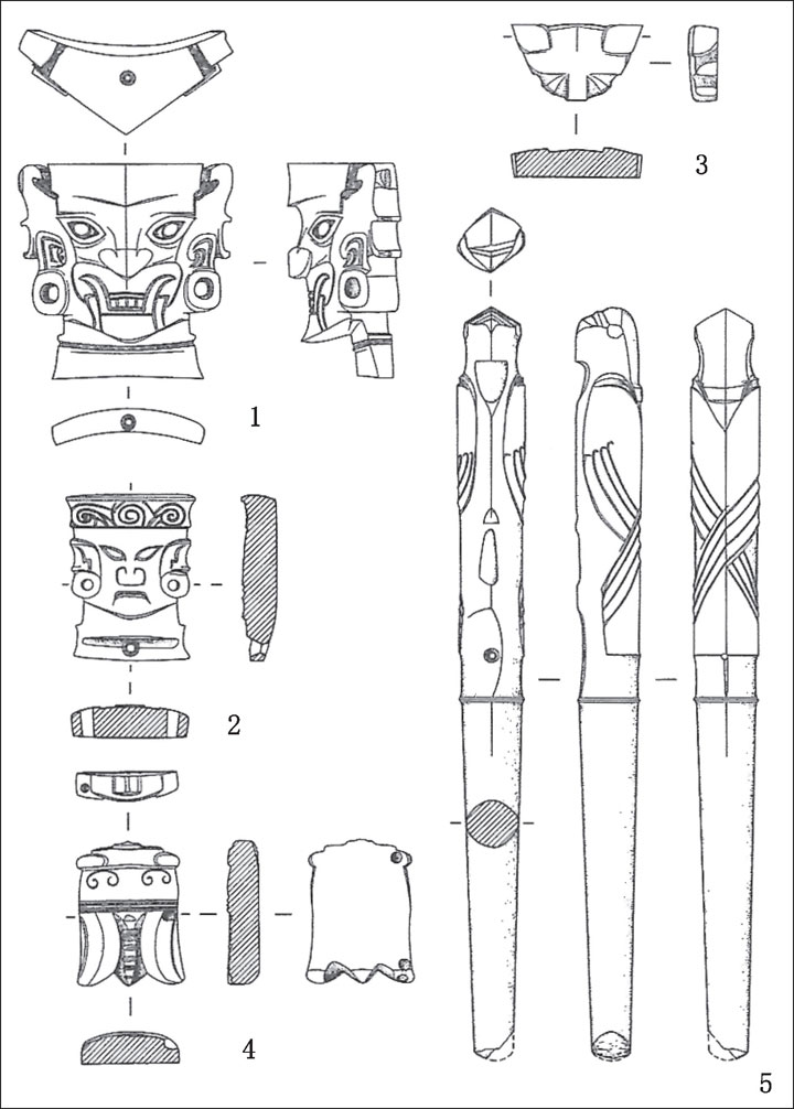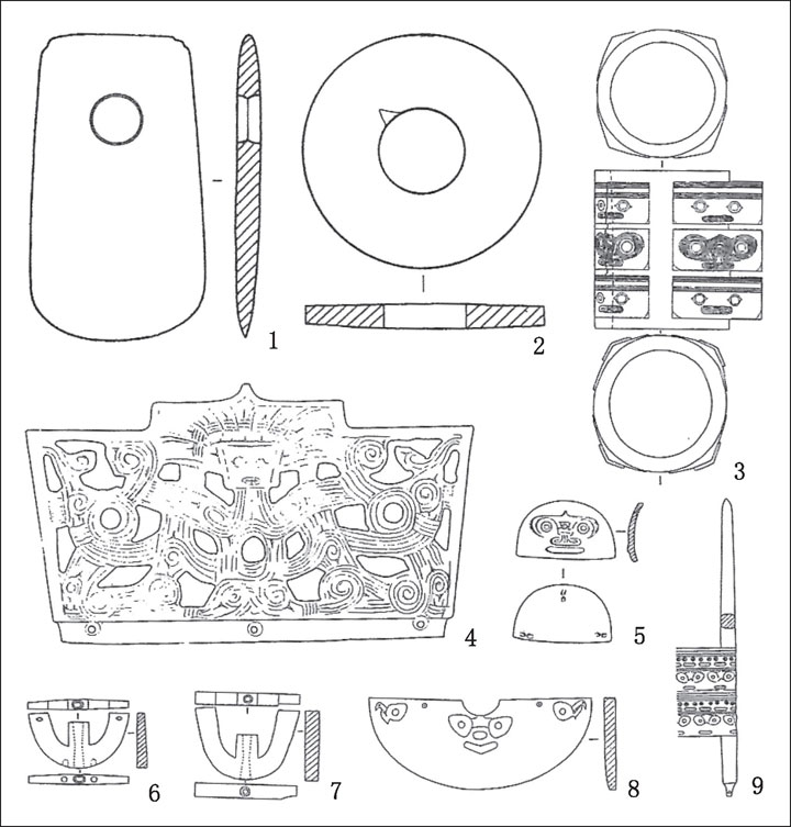 人物像用整块玉雕成,佩戴圆形大耳环,蒜头鼻、眼梢向上,牙齿外露,形象独特而鲜明。动物像多以蝉、鹰为原形。这些玉器是当地特有的威信物。当地独有的大型瓮棺墓就是作为拥有这些玉器的特定阶层的成人墓葬而出现的。