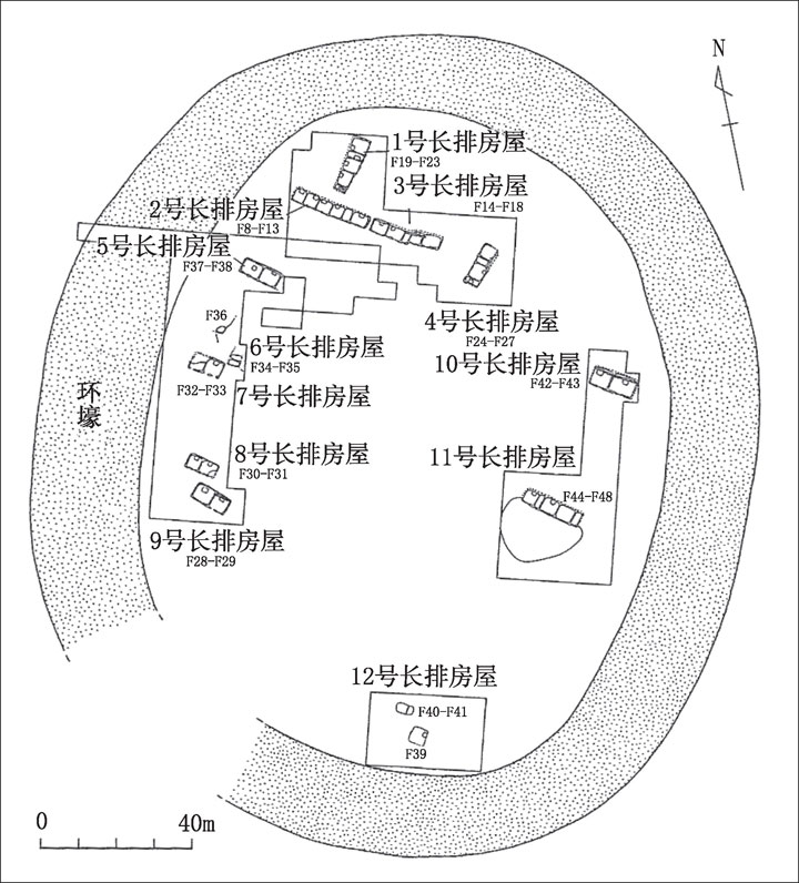 环壕的作用在于阻挡来自聚落外部的野兽等威胁,同时又有团结聚落成员,助其产生群体意识的作用。如目前的复原图所示,房屋布局以大型房屋为核心,中小型房屋分布在其周围。中小型房屋的规模由单位家族的成员多少决定,而大型房屋作为半族内的集会场所而存在。
