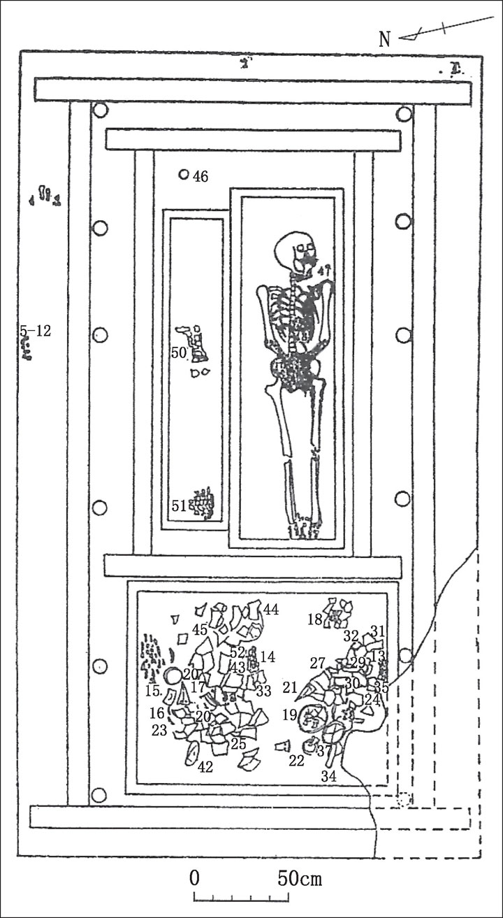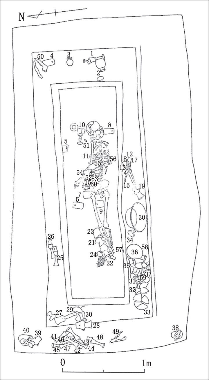 同时埋葬还是有时间间隔的埋葬,是一个事关殉葬这个解释是否妥当的问题,所以在发掘考察时应当加以慎重讨论。但是,合葬墓中的安置位置已有男左女右的固定原则。并且从墓葬构造、随葬品的数量及种类来看,男性被葬者都处于相对优势的立场。