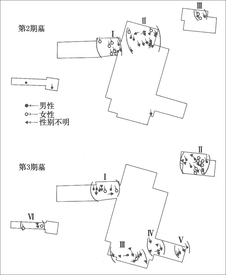 那么是否可以认为A群体和B群体是有着共同起源的半族关系的群体单位呢?如果这个想法成立的话,三区墓地就可看作是由A、B两个主要家系构成的双分制群体,而来自其他群体的外婚者则被埋葬于C群。如此看来,一区墓地和二区墓地也可看作处于另一组双分关系的两个群体。这种解释才是如前所述,认为基于外婚规制的双分制曾经存在的、从墓地的角度来进行考察的根据之所在。