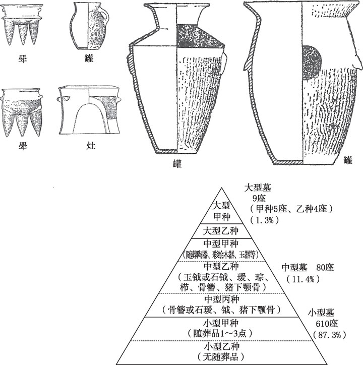 另一方面,大溪遗址的随葬品以陶器为中心,但并不像黄河中游地区那样随葬品在性别区分上存在明显的差异。大溪墓葬前期在随葬品数量上差异较小,而大溪墓葬后期则在随葬品数量上出现多寡悬殊增大的倾向,显示出群体内埋葬等级的差异逐渐扩大的过程。但是这种埋葬等级的差异并非因性别而异,而是在群体内以血缘关系为单位发生的阶层分化。