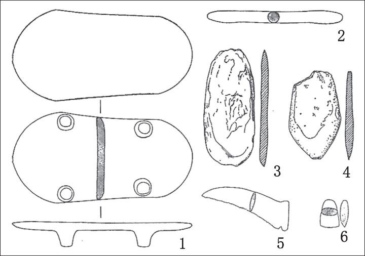 在考虑该群体的社会进化水平的问题的时候,可以对应着墓葬的随葬品构成及其性别差异的问题来获得线索。随葬品中有磨盘和磨棒,是用来把粟、黍制成粉末的工具。另外还有用于开垦田地或土木作业的锄。在这一时期,以定型的石铲为锄头的石锄最为普遍。我把这类石铲以及磨盘、磨棒称为华北型农耕石器。其普及时期是在新石器时代前期。