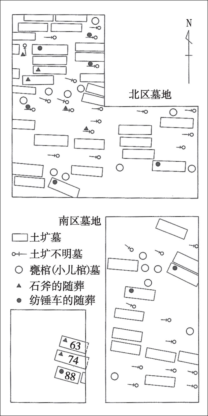 在瑶山及反山土墩墓,墓葬呈列状分布,各列之间的随葬玉器在内容上均存在差异。例如瑶山土墩墓有南北两列墓群,两者在随葬品上显示着区别。南列的随葬品有玉琮、玉钺和三叉形冠饰,北列则随葬有玉璜、纺车。遗憾的是,被葬者的人骨已经腐化,未能保留下来,所以无法用体质人类学的方法加以鉴定。南列特有的玉琮等随葬品在北列不曾出现,两者为排他性的墓列关系。这种关系显示,空间分布的差异很可能依据的是男女性别的差异。也就是说,因为玉璜及纺车这类随葬品在崧泽文化阶段对应着女性墓的附葬品,由此可知直到这个阶段,男女性别差异依然是决定墓葬差异的重大因素。