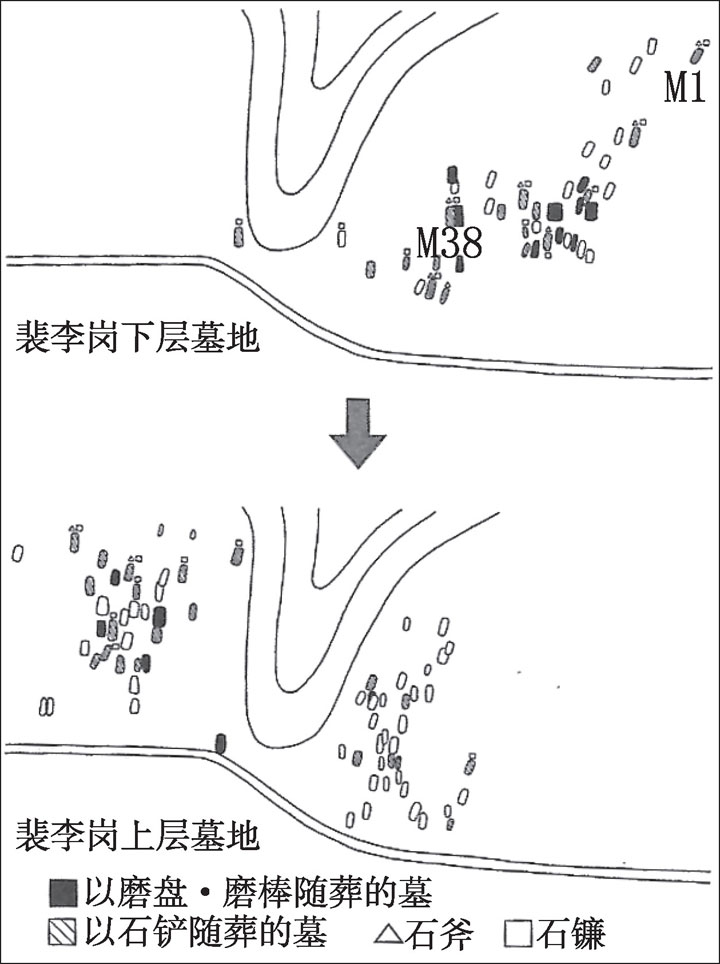 关于裴李岗墓葬的变迁,从陶器的样式研究上来看,大致可分为两个时期。较古阶段的墓葬群位于低矮丘陵的东侧斜坡之上,而较新阶段的墓葬不仅在东侧,还扩大至西侧斜坡,这是由于聚落群体扩大后分化为两个群体所导致的现象。其扩大应该是通过新群体分离而出的形式实现的。