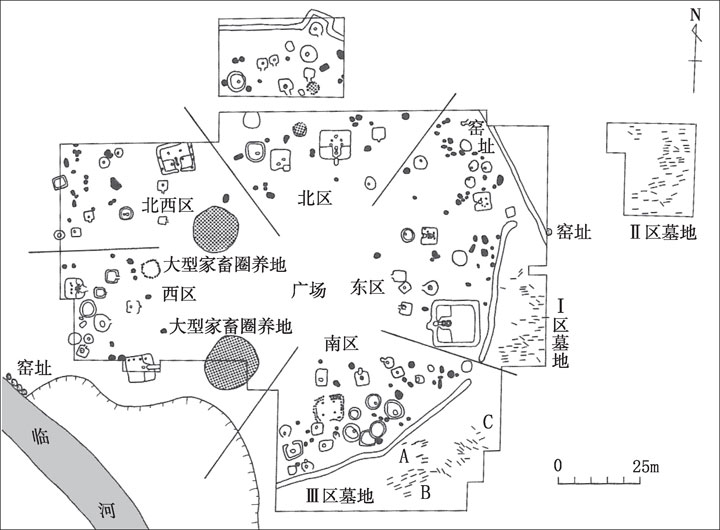 广场附近有两个用于饲养家畜的大型围场。用栅栏围成圆形,饲养的家畜据推测是猪和牛等。如果这些围场存在于同一时期的话,姜寨遗址前期的群体单位即前期的以半族为单位的管理,同时也是家畜管理的基本形态。在聚落分化为四个群体之后的姜寨遗址中期,家畜管理的基本依然保持以前的两个群体单位,即以聚落初期的双分式的半族为基本单位。从这个意义上看,烧制陶器的两处陶窑如果也是并存于同一时期,即说明在陶器制作上也存在着双分式的生产形态和生产组织。