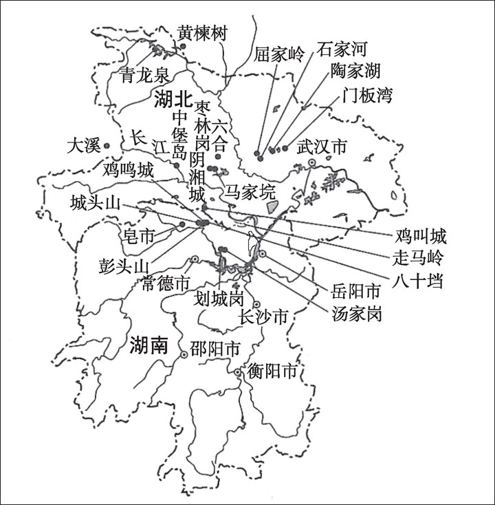 现在在长江中游地区,共发现了九处据推测建造于屈家岭时期的城址遗址。如图70和图71所示,在这些遗址当中,集中于汉水流域的城址遗址有三处:城址遗迹单边长超过1000米的石家河遗址,其次是单边长约900米的陶家湖古城,单边长约500米的门板湾遗址。在沮漳河流域,单边约500米的城址遗址有两处;而在澧水流域至洞庭湖北岸一带,密集着四处单边长300—400米左右的城址遗址。