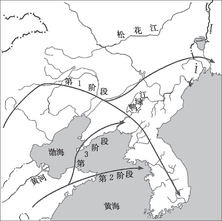 而在朝鲜半岛南部真正开始拥有水田,与旱地农业并行的水稻农业则要等到公元前2000年代的末期。这样的水稻农业也可能是经山东半岛南部的黄海沿岸北上的水田技术从山东半岛东端向着辽东半岛、朝鲜半岛扩散开来的。我把朝鲜半岛开始正式的水稻农业的这个阶段称之为朝鲜半岛初期农业化的第三阶段。正是这第三阶段农业化的内容形成了日本列岛弥生社会的母胎。就这样,朝鲜半岛初期农业化第二阶段及其第三阶段的胎动都是从山东半岛东端的胶东半岛向朝鲜半岛汉江下游地区扩散而来,或是从胶东半岛再经辽东半岛传入朝鲜。这与前文论及辽东地区农业扩散的区域发展时所说的那样,新石器时代中期后半段以后的大汶口文化在胶东半岛的粟、黍农业化及其后以山东半岛南端沿黄海沿岸北上的途径为大动脉的水稻扩散,这两者相遇于胶东半岛的历史也关系着朝鲜半岛的初期农业化。