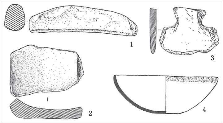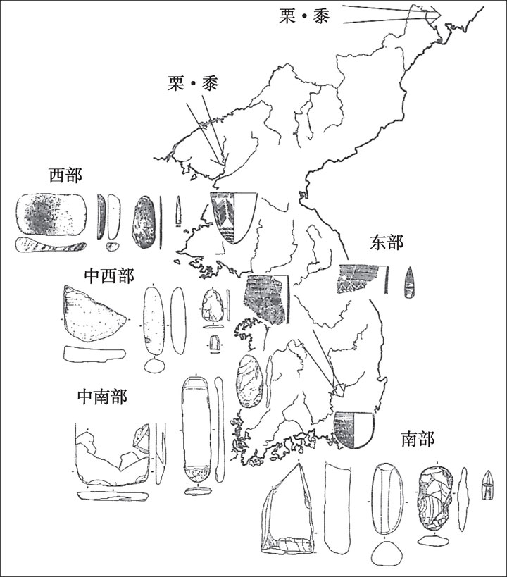 与上述华北的新石器时代早期、前期的常见石器一起传入朝鲜半岛的还有见于辽东的柳叶型磨制石镞。与这些石器群同时,在大同江下游地区成型、以尖底深钵为特征的篦纹陶器也从朝鲜半岛西海岸的北部向着南部或东南扩散。而且扩散开来的是一个文化整体。陶器样式和石器样式以及粟、黍农业等生业经济也包括在这个文化整体之中。也就是说,这种扩散并非仅由一部分文化上的属性形成的文化传播,而是一种由综合性的文化属性形成的文化传播。