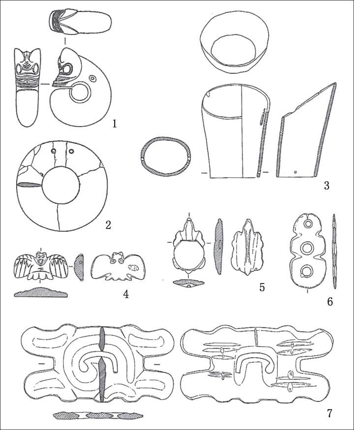 除了这类细致的墓葬构造,随葬品中还包括了红山文化特有的玉器。这些玉器的种类主要有玉璧、玉环以及勾云形佩饰、箍形器等装饰品。还有模仿龟、鸟、猫头鹰等动物形象的玉制品,以及被称之为猪龙和龙的想象中的动物形象。这些玉器在作为威信物的同时,应当也存在着宗教上的意义。