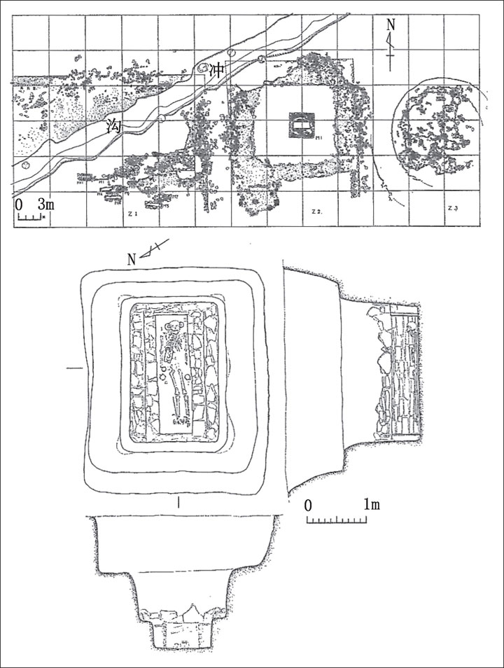 积石冢内部得到发掘的墓葬目前共六十一座,其中三十一座为拥有随葬品的墓葬。拥有随葬品的墓葬设有箱式石棺,无随葬品的墓葬只有简单的土圹,在墓葬构造上也显示出阶层差距。另外拥有随葬品的墓葬当中有二十六座是只随葬着玉器的墓葬。占拥有随葬品的墓葬总数的84%。这反映了玉器作为随葬品的特性,同时也意味着被赋予宗教含义的正是社会的领导者。玉器与其说是用来显示被葬者的在经济上的优越地位,不如说是用来显示其宗教上的权威。