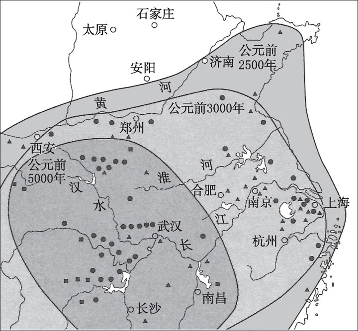 关于淮河以北引入稻作农业的社会,原本是以粟、黍农业即华北式旱地农业为基础,并在此基础上吸收了稻作农业。可以说该地域通过吸收稻作,得以实现多角经营的农业生产。另外,在稻作农业的扩散期,文化上的影响并非以文化复合体的方式扩散。也就是说,传播的只是水稻或稻作技术。华北的社会群体并非把水稻作为来自其他区域的文化影响之一环加以吸收,而是有意识地只吸收了稻作技术。从这个意义上来说,这与前面提到的粟、黍农业从北方地区农业社会向非农业社会的扩散有着质的区别。那么南方稻作农业是如何从农业地带向非农业地带扩散的呢?