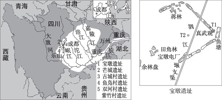 始于长江中下游地区的稻作农业向北、向东扩散的同时,也逐渐向长江上游的四川盆地扩展。可以认为是新石器时代中期兴盛于长江中游地区的大溪文化对长江上游地区产生了影响。那么在此过程中,稻作农业应当也随之扩散到四川盆地。实际上,宝墩文化被认为是受到延续着大溪文化谱系的重庆地区的哨棚嘴文化的影响而产生的。宝墩文化是在与新石器时代后期长江中游的石家河文化并行的阶段产生的区域文化。