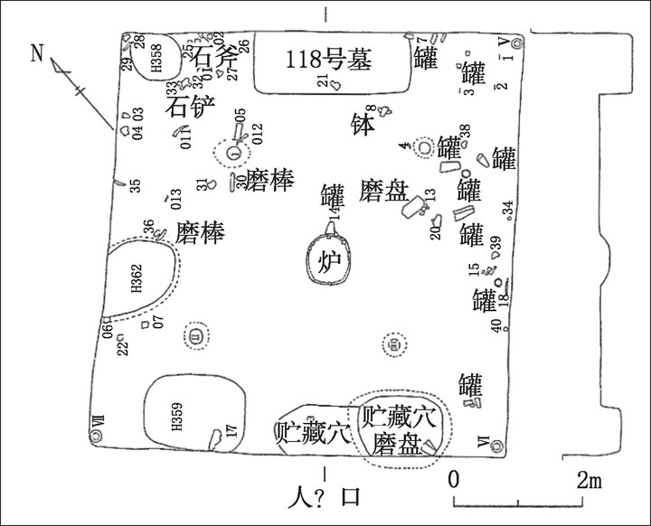 从入口处面向屋内的右侧集中着用于加工食物的磨盘以及用于烹煮的陶罐。左侧内部集中有石铲、石斧等用于土木作业和木工的用具。在已存在性别分工的当时,炊事和食物加工用具代表女性劳动,而土木工具和木工用具则代表着男性劳动。房屋的左手边为男性空间,右手边为女性空间,这些配置反映出整个家庭的生活状况。第一代祖先被供奉于神圣的空间,并发挥着家庭纽带的作用。