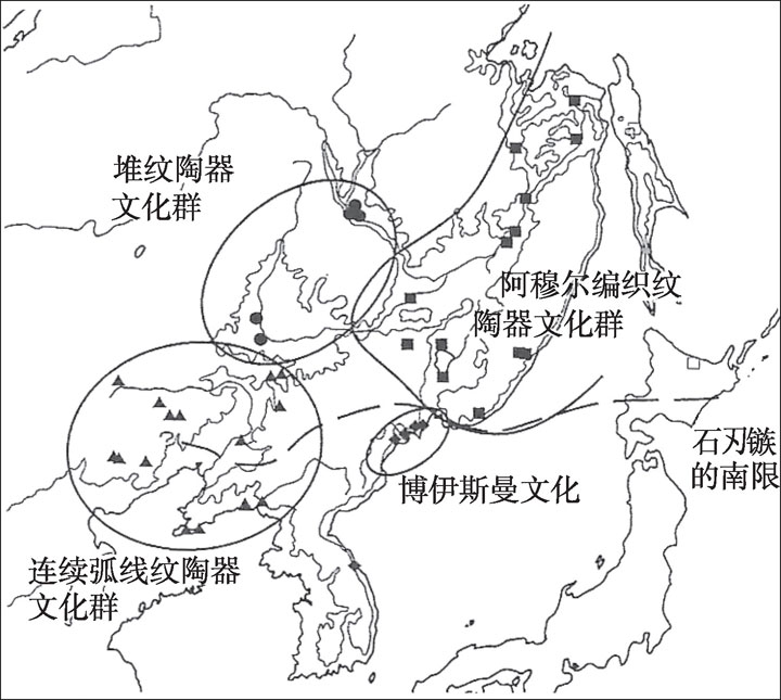 如前所述,这些地区在整个新石器时代基本上全都属于远东平底陶器的区域,依照其陶器纹样系统又可大致分为三个区域。