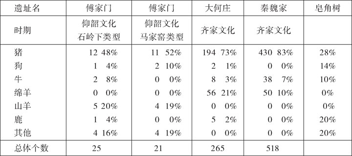 同样在傅家门遗址,上述现象在新石器时代后半期的仰韶文化马家窑类型时期依然持续。新石器时代后期的齐家文化中,如大河庄遗址和秦魏家遗址的事例所显示的那样,鹿的猎获只有极少的数量或几近于零。另一方面,这两处遗址与仰韶文化石岭下类型及马家窑类型的遗址相比,对猪的依存度进一步提高,加上绵羊、牛等畜牧动物,约占总数的20%,比率大为提高。这里几乎没有狩猎的迹象,蛋白质的来源几乎专门依靠猪、绵羊、牛等家畜。值得注意的是,这些地区与同时期的内蒙古中南部相比,对家畜的依存度处于更高的状态。