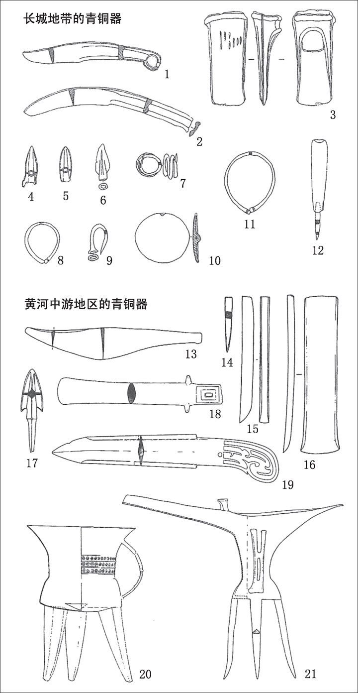 与之相对,发展了以青铜礼器为中心的祭祀仪礼体制的黄河中游地区则作为商周社会的母胎走上了农业社会的进程。在新石器时代后期以后,畜牧农业社会从农业社会中分离出来,长城地带不论是在社会性质还是文化特征上都与黄河中、下游地区逐渐分离,这种状况也体现在青铜器的发展与融合过程之中。