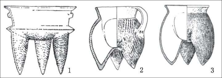 在农业社会与畜牧型农业社会发生分离的新石器时代后期,还可看到另一个现象。一种名为鬲的三足煮沸具出现在农业社会与畜牧型农业社会的接触地带。鬲与同样是三足器的鼎不同,三足部分为中空,这是鬲的特征。这种足部中空的形状在鬲出现之前也见于同为三足器的斝。