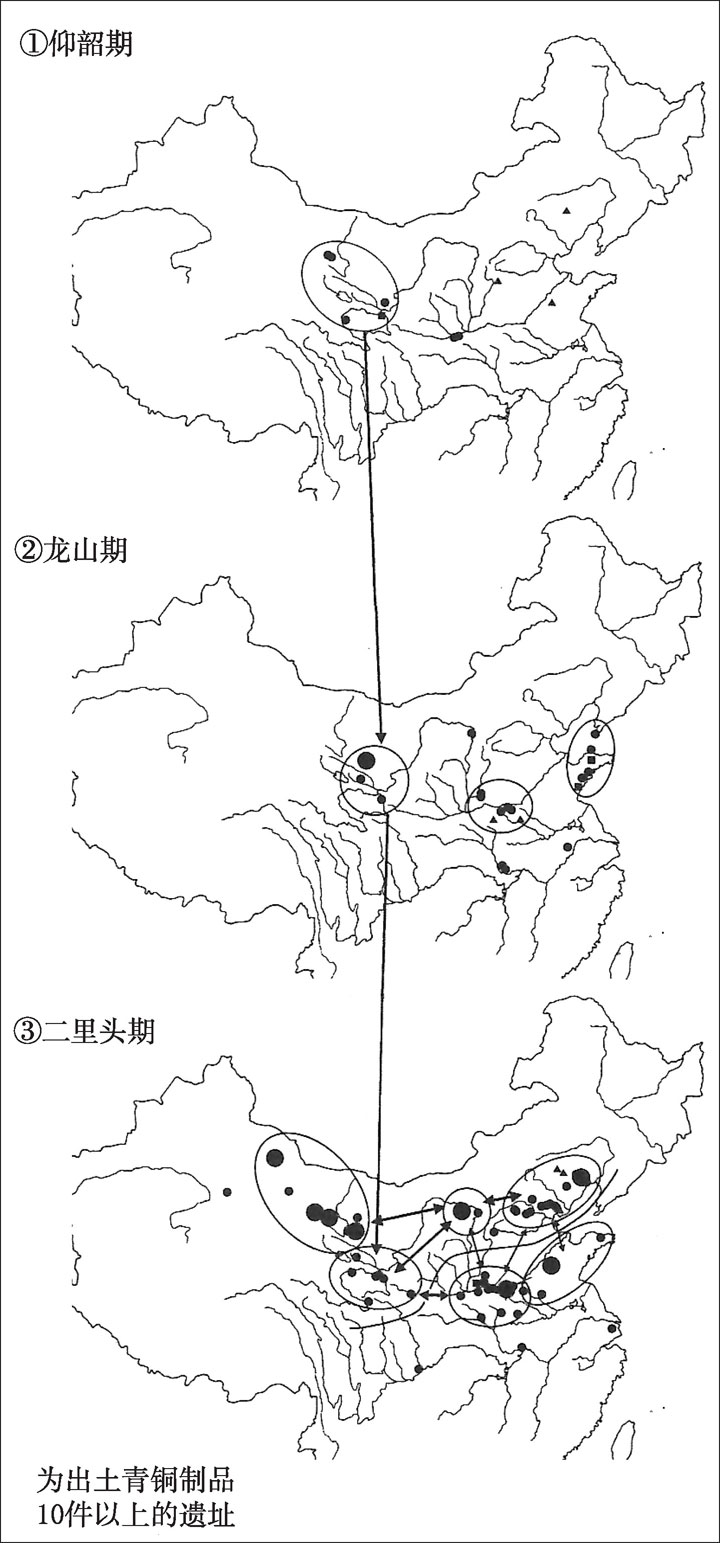 西亚及其相邻的中亚在较早阶段就已拥有青铜技术,而在东亚西北部的黄河上游地区也发现了许多较早阶段的资料。因此我认为青铜器和纯铜的技术很可能是在来自西方的文化交流中经过欧亚大陆传入东亚的。