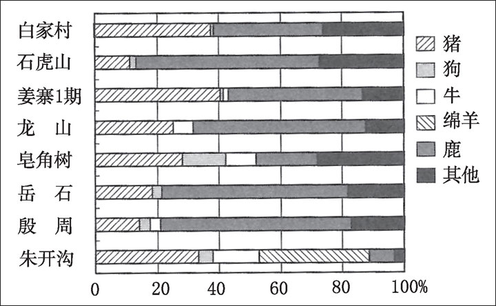 在黄河中游地区,前期的白家村遗址中,作为家畜的猪和作为狩猎对象的鹿大约各占四成。由于白家村遗址的数据未显示最少个体数,实际上是根据头骨的数量得出的个体数。但从与新石器时代中期初始的姜寨1期的比率的比较来看,可以认为这个数据基本接近最少个体数。姜寨1期与白家村遗址显示着大致相同的倾向,但前者猪和鹿相对总数的比率更高。在相当于同一时期的内蒙古中南部的石虎山遗址,比起黄河中游地区,家猪的比率较低,而鹿的比率则较高。这里的鹿科动物主要有大型的马鹿及中小型的梅花鹿和獐等。这些动物生长在森林地带,可以想见当时的生态环境与现在内蒙古中南部已草原化的环境有着相当大的差异。而家猪比率较低说明当地较同时期的黄河中游地区,其农业的发达程度或者说对农业的依赖程度较低。