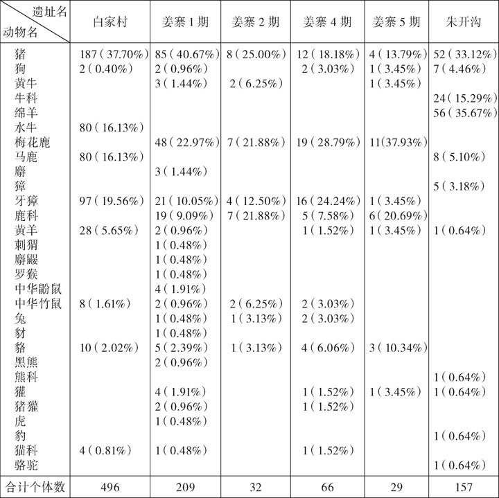 另外,遗址出土的动物组成也反映出该时期的气候条件。从白家村遗址、姜寨1期、姜寨2期以及姜寨4期的鹿类动物来看,白家村遗址虽有马鹿,但新石器时代中期的仰韶文化姜寨1期至姜寨4期却是以梅花鹿为主,其他种类也只可见牙獐而已。同样从鹿类来看,内蒙古中南部的石虎山遗址以獐和梅花鹿为主体,在种类上显示着相当大的差异。