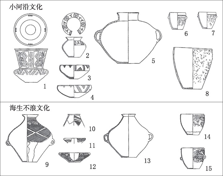 而到了海生不浪文化时期,该地区也出现了筒形罐。在此之前,筒形罐在系谱上并不存在于该地区,所以我们不得不认定这是从与之相邻的辽西地区传入的陶器。