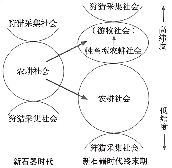 也就是说农业社会成立后在其周边地带依然存续着旧石器时代以来的狩猎采集社会,而在农业向北方扩散的区域之中又产生了畜牧型农业社会。畜牧型农业社会在西周以后的寒冷干燥化中形成了以畜牧为主的新的社会经济体系,游牧社会由此开始。就这样亚洲东部的水平方向的社会分支逐渐完成。即农业社会,从农业社会分支出来的畜牧型农业社会及其发展型即游牧社会。并在其周边的西伯利亚至北极、热带地区形成了狩猎采集社会。