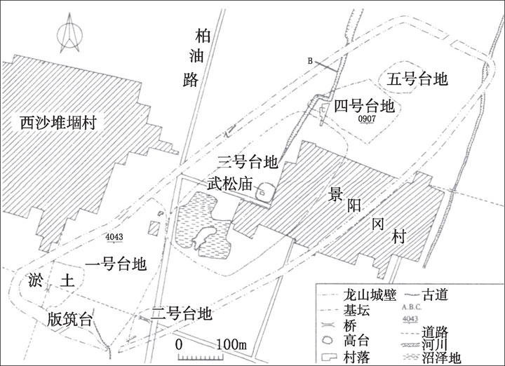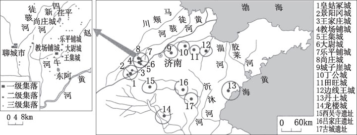 山东省文物考古研究所所长张学海先生根据上述城址和聚落的规模不同将其划分为三个等级:如教场铺遗址和景阳冈遗址为第一级的城址遗址;围绕其周边规模较小的是第二级的城址遗址;第三级为规模更小的普通遗址。这是一个非常卓越的观点。在上述区域内的片区单位中,拥有聚落阶层构造的遗址群曾经并存于山东境内。