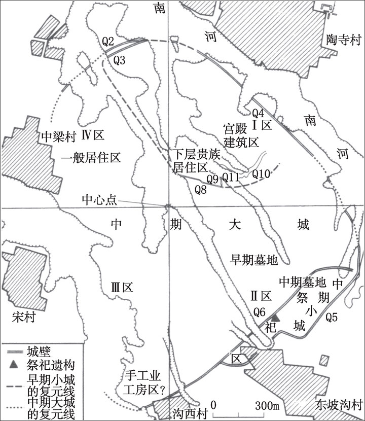 这一点从逐渐判明的城内空间利用的平面区分上也得到了证实。小城内南部为宫殿建筑区,从房屋规模来看,其西侧和东侧分别为下层贵族和上层贵族的居住区。而这种空间的平面区分在长江中游地区的大型城址遗址中是见不到的。