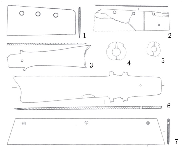 另外,新石器时代中期的安徽省薛家岗文化盛行石刀形玉器,这种玉器也见于山东,在山东龙山文化阶段的墓葬中多用于随葬品。石刀上面通常由一至两个穿绳用的圆孔,而石刀形玉器则以多孔为特征。石刀形玉器的分布范围也是在龙山文化期扩散到了西北地区。出土此种玉器的地点不仅只在位于长城地带接触地区的陕西延安芦山峁遗址和神木石峁遗址等处,还有西北地区的属于齐家文化的青海大通上孙家寨遗址。石刀形玉器又称玉刀,与玉璋同样,出土于二里头文化期的二里头遗址等处。