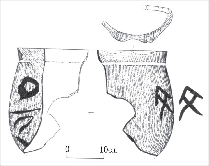 在陶寺遗址发现了城垣遗址的是社会科学院考古研究所的何驽先生。他尤其重视过去出土于该遗址的朱书文字陶器。这是一种名为扁壶的陶器,器身部分的一面是平坦的,形状较为特殊。因为大多发现于水井底部,通常认为扁壶是用来汲水的陶器。扁壶的凸面与平面上用红色各写着一个文字。