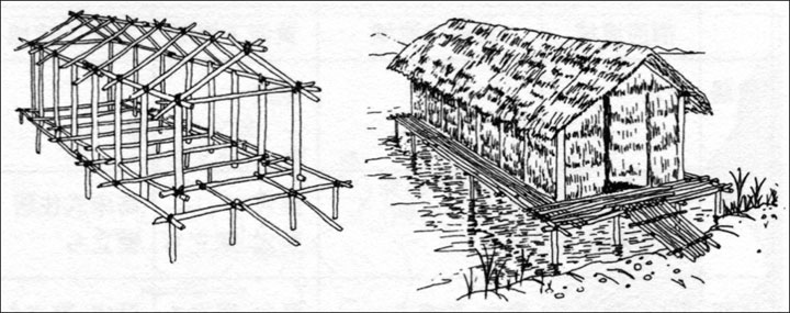 而在长江下游地区,新石器时代中期的浙江省余姚市河姆渡遗址以及浙江省桐乡县罗家角遗址则是采用干栏式建筑。这与广东高要茅岗遗址的事例相同,是湖沼地带特有的房屋构造。