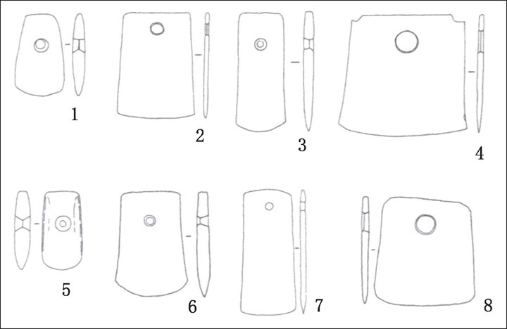 同样因交流而生的还有石钺,在石斧的基部一侧开有圆孔即石钺的形状,也称有孔石斧。石钺本来与石斧同样用作工具,后来逐渐被用作武器,并日渐转化为象征武力权威的器物。不再作工具之用的有孔石斧正确的称呼应当是石钺,但是从形态变化来看,二者很难加以明确区分。在此把二者统称为石钺。