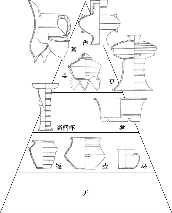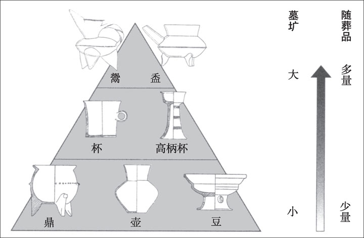 鼎、壶、豆(高杯)是普通平民的随葬陶器,在这些器种的基础上还随葬有杯的墓葬,属于比普通平民更上一层的阶层。而在这些器种的基础上再加上鬶或盉等酒器,就相当于最上层阶层的墓葬。