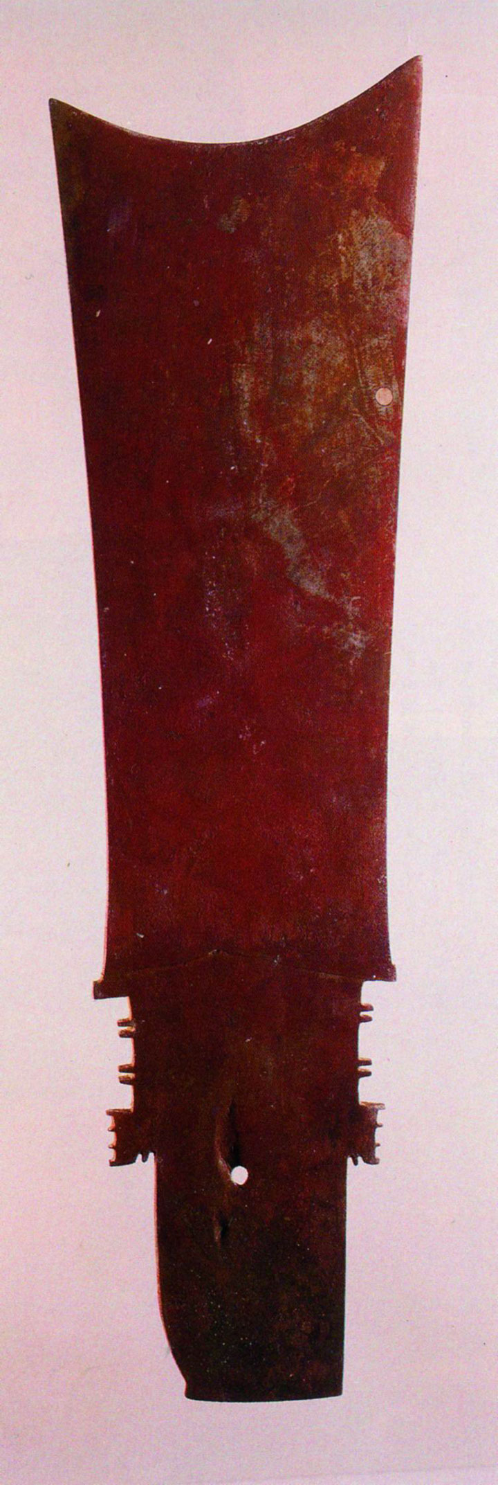 例如在黄河下游地区的山东龙山文化期,曾流行玉刀及玉璋等大型玉器。玉刀是玉制的菜刀形大型玉器,也被称为石刀形玉器。玉璋为左右不对称的长条形玉制品,底部有齿状突起。其源头很可能是河姆渡文化及马家浜文化的土木工具骨制锄,所以又称为骨铲形玉器。
